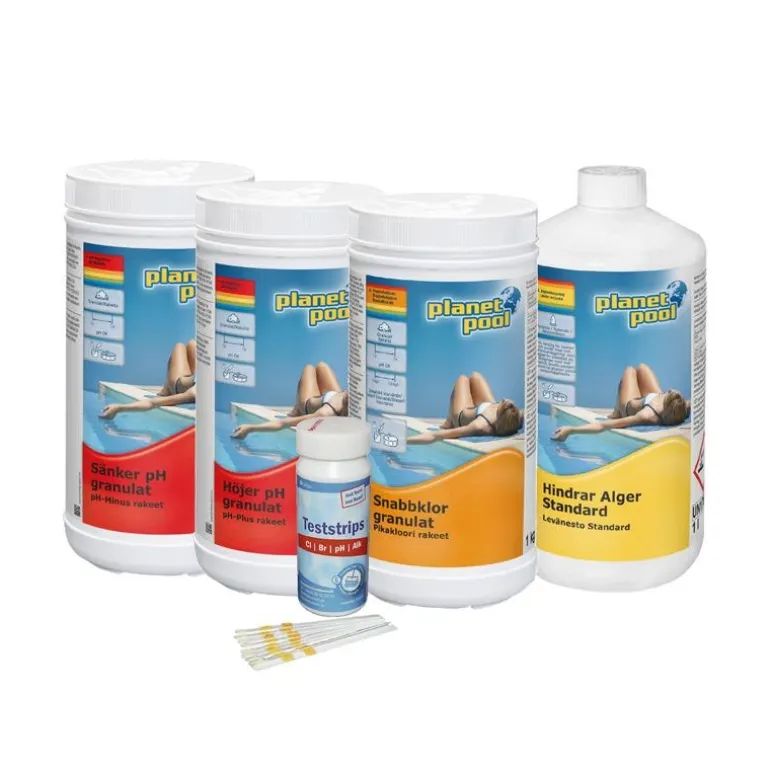Aloituspakkaus, joka sisältää kaiken, mitä tarvitset päästäksesi alkuun altaan hoidon kanssa. Aloituspakkaus sisältää 1,5 kg pH-Minus-rakeita, 1 kg pH-Plus-rakeita, 1 kg Pikakloori-rakeita, 1 l Levänesto Standard -leväntorjunta-ainetta, testiliuskoja ja käyttöoppaan.