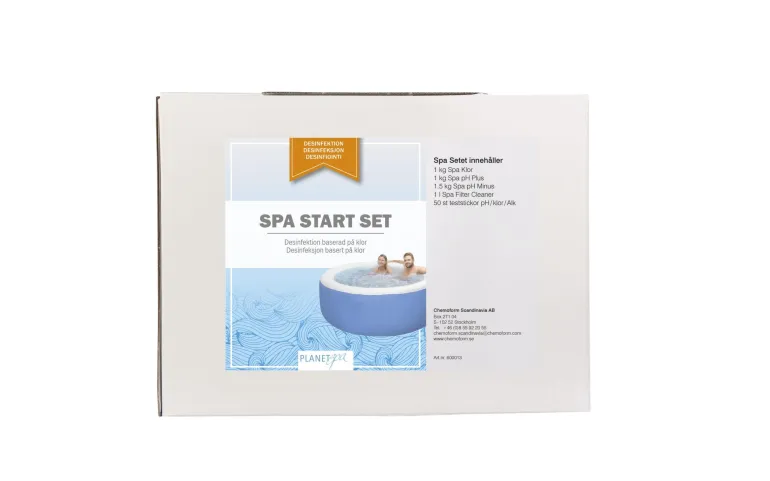Poreammeen aloituspakkaus, jossa mukana 1 kg Spa Klor, 1 kg Spa pH Plus, 1,5 kg Spa pH Minus, 1 litra Spa Filter Cleaner sekä testiliuskoja.