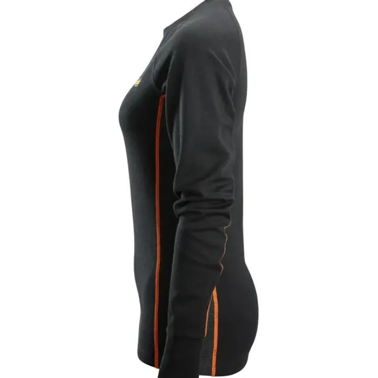 Naisten merinoaluskerraston yläosa, joka on suunniteltu kylmiin olosuhteisiin. Kaksinkertaisesta neuloksesta tehty rakenne, jossa yhdistyvät villan lämpö ja erinomaiset kosteutta siirtävät ominaisuudet. Suunniteltu mukavuutta varten kylmiin olosuhteisiin. Tässä toiminnallisessa aluskerraston yläosassa on kaksinkertaisesta neuloksesta tehty rakenne ja naisille täydellisesti sopiva istuvuus. Ulkopinta on valmistettu 100 % mulesing-vapaasta merinovillasta, joka on erittäin lämmin. Synteettisistä kuiduista valmistettu sisäpuoli siirtää tehokkaasti kosteutta pois iholta aiheuttamatta kutinaa. Yläosassa on koristeelliset tasosaumat hankautumisen minimoimiseksi. Peukaloreiät hihansuissa lisäävät mukavuutta. Snickers Workwear -logo.