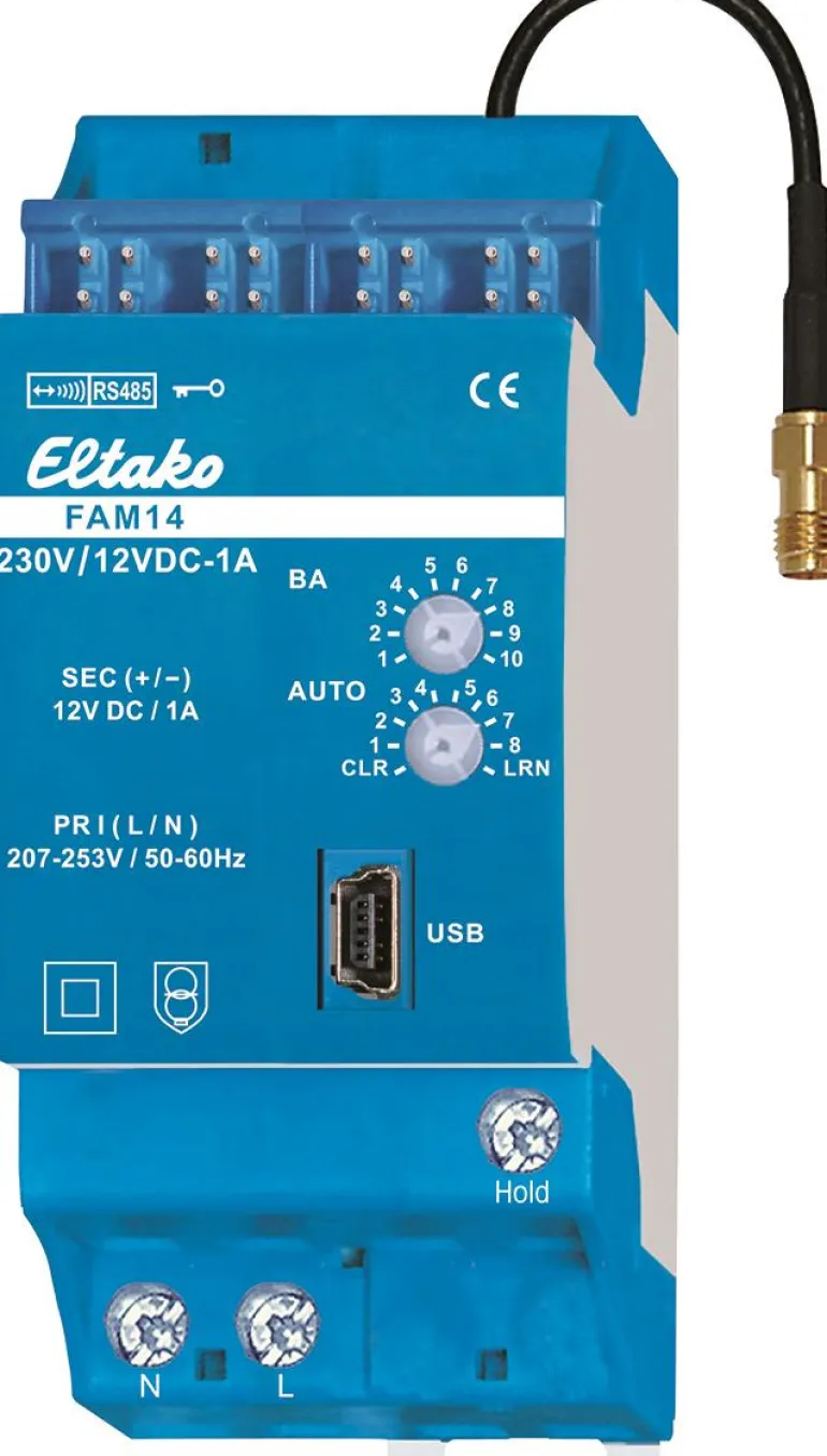 Antennimoduuli/perusyksikkö Eltakos RS485-väyläsarjaan 14 yksikköä. Sisäänrakennettu virtalähde 12VDC/12W. FAM14 on Eltakosin DIN-toimilaitteiden perusyksikkö