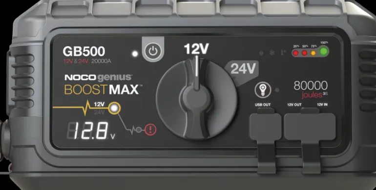 GB500 on kannettava litiumioniakun käynnistinpakkaus, joka tuottaa 20 000 A:n käynnistysvirran. Laite pystyy käynnistämään täysin tyhjentyneen akun vain muutamassa sekunnissa. Apukäynnistin on patentoidun teknologian ansiosta kestävä, kompakti ja tarjoaa käänteisen polariteetin suojauksen. GB500 on monitoiminen apukäynnistin, jolla voit ladata myös USB-laitteet ja jota voi käyttää myös 12 V:n laitteiden kanssa. GB500 lataa nopeasti Apple-laitteet, kuten iPhonen, iPadin tai iWatchin, sekä GoPro-laitteet ja Bluetooth-kaiuttimet sekä -kuulokkeet. GB500 on suunniteltu käynnistämään kaikentyyppisiä ajoneuvoja, kuten raskaita ajoneuvoja, kuorma-autoja, veneitä, autoja, matkailuautoja jne. Gb500:n avulla voit ladata myös 12 V:n rengaspumput, kahvinkeittimet, puhaltimet ym. Apukäynnistimessä on varusteena erittäin tehokas LED-taskulamppu, jossa on jopa 7 eri asetusta, mm. SOS- ja varoitusvalo hätätilanteita varten. Voit käyttää sitä tavallisen taskulampun tavoin, kun peset autoa, vaihdat renkaita ja tutkit moottoria pimeällä tai haluat osoittaa muille tielläliikkujille, että kävelet auton ympärillä. Käyttömahdollisuuksia on lukemattomasti. GB500 on Noco Genius -sarjan suurin apukäynnistin, joka tuottaa jopa 20 000 A. Laitteessa on myös integroitu kosketin 12 V:n ja 24 V:n välistä vaihtoa varten. Integroitu näyttö osoittaa akun reaaliaikaisen jännitteen, joten voit suorittaa helposti esimerkiksi vianmäärityksen. GB500 on helppokäyttöinen, mutta jos + ja – vaihtavat paikkaa, se ei haittaa, koska käynnistimessä on käänteisen polariteetin suojaus. GB500 on myös täysin kipinöimätön.
