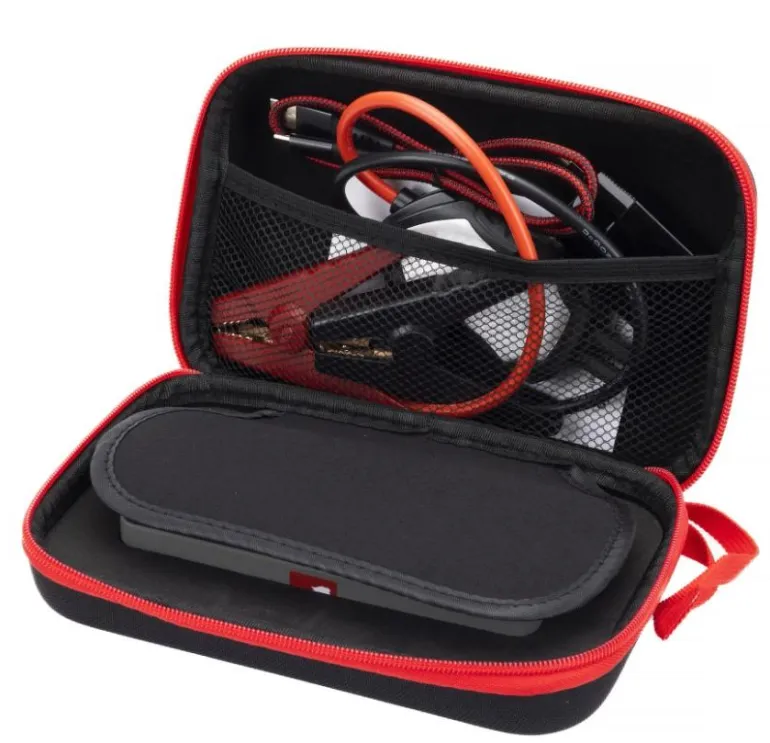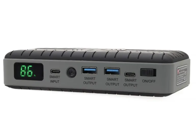 Laitteessa on liitännät myös muiden laitteiden lataamiseen: 1 kpl USB-C ja 2 kpl USB-A. Laite ladataan mukana tulevalla USB-C-kaapelilla ja laturilla. Toimitetaan kätevässä laukussa, sisältäen myös kaapelit apuvirran antamiseen.