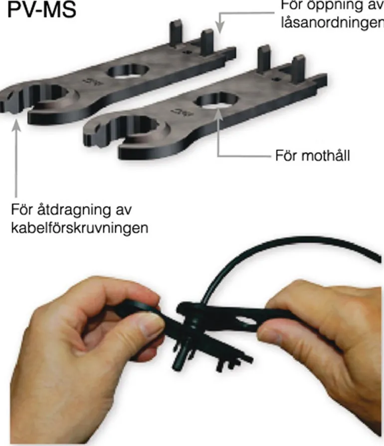 PV-MS on muovinen asennusavainsarja MC4:lle (PV-4 mm). Sarja sisältää kaksi asennusavainta kaapelitiivisteen asentamiseen ja poistamiseen sekä lukituslaitteen avaamiseen.