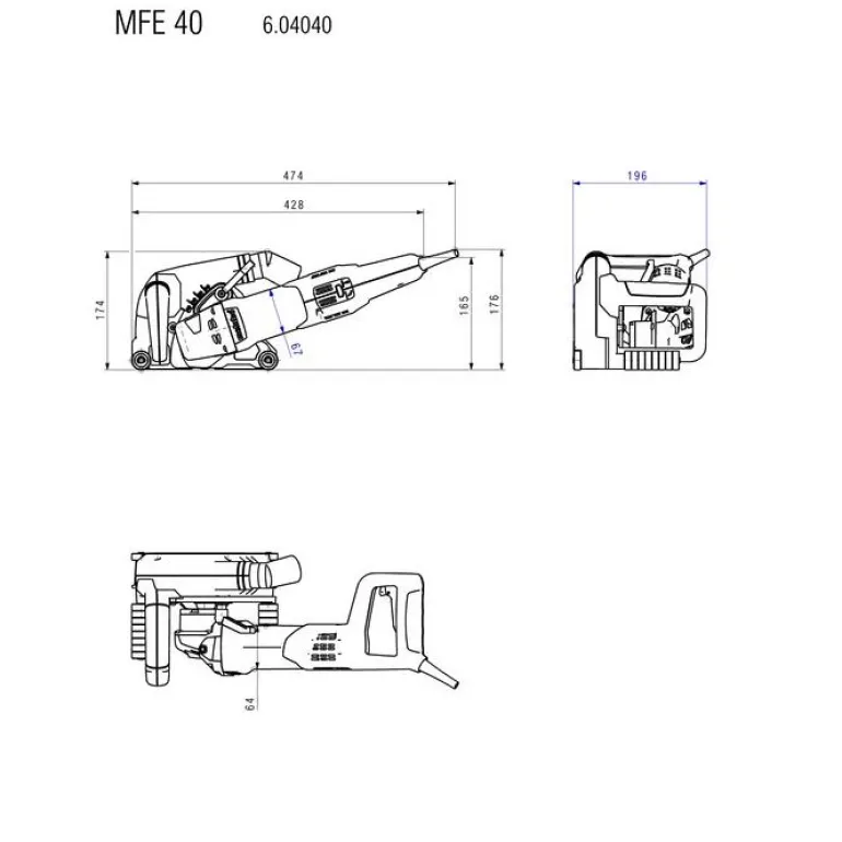 Metabo MFE 40 on asennusjyrsin, jossa on 125 mm:n katkaisulaikka. Soveltuu sähköasennuksiin urien tekoon kaapeleille ja kaapeliputkille. Suurin jyrsintäsyvyys 40 mm ja urien jyrsintä 30 mm:n leveyteen asti (erikoisvarusteilla). Konetta voidaan käyttää myös katkaisuun timanttikatkaisulaikan kanssa.
