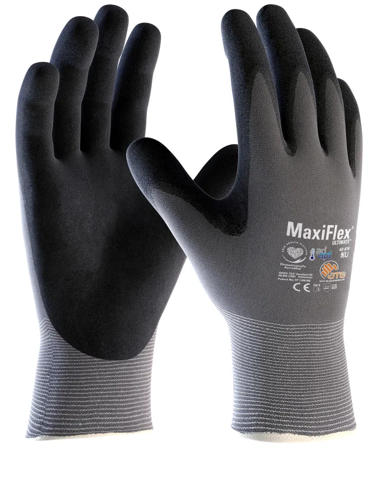 ATG Maxiflex ULTIMATE 42-874 on erittäin kestävät asennuskäsineet, joissa on pinnoite kämmenessä ja neulottu hihansuu. Adapt-toiminnolla varustettu patentoitu nitriilimikrovaahtopinnoite takaa saumattomasti parhaan mahdollisen istuvuuden ja parantaa hengittävyyttä. Soveltuu mekaaniseen tarkkuustyöhön. Käsineet ovat silikonittomat, ja ne on pesty ennen pakkaamista, joten ne ovat taatusti puhtaat ja tuoreet, kun otat ne pakkauksesta.