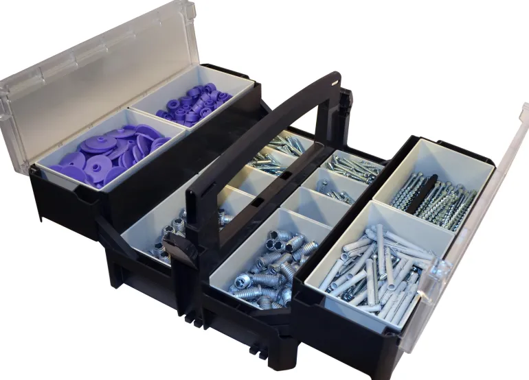 Adjufix Premium Pack on joustava ja pinottava Tanos-laukku, joka sisältää yleisimpiin ikkuna- ja oviasennuksiin tarvittavat kehyskiinnikkeet.