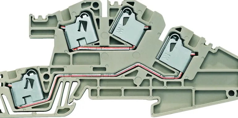 Weidmüller PDL 4 S/L/L -liitin Weidmüllerin Push In -sarjassa. Yläkiinnitysliitin enintään 16 mm²:lle.