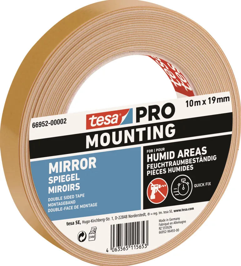 Kiinnittyy turvallisesti ja lujasti myös kosteissa ympäristöissä: Korkean kosteudenkestävyytensä ansiosta tämä teippi on suunniteltu ensisijaisesti kylpyhuoneissa olevien laattojen kiinnittämiseen. Luotettava pito ilman pysyviä reikiä: Tesa PRO -ASENNUSPEILIN avulla ei tarvita ruuvia, tulppaa tai naulaa – painavampien esineiden kiinnittäminen ei ole koskaan ollut helpompaa. Kuuluu kaikkiin ammattimaisiin työkalupakkeihin: Tesan kaksipuolinen teippi peileille helpottaa modernien käsityöläisten työtä paikoissa, joissa ei ole mahdollista tehdä ruuvinreikiä.