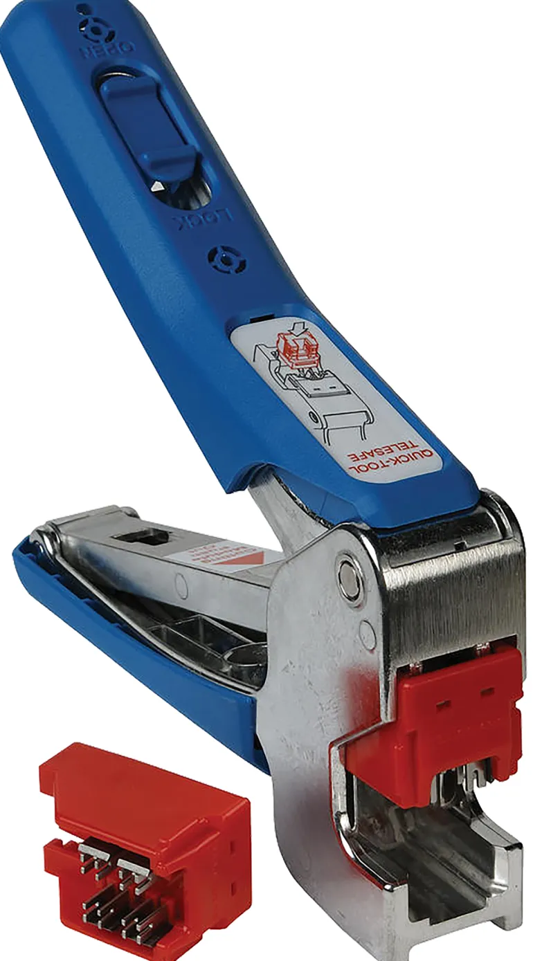 Asennustyökalu TCS QuickConnect jack UTP- tai STP-yksiköille. Käytä asennuksen yhteydessä QuickConnect-työkalua. Ylimääräinen osuus leikkautuu pois johdinten yhdistyessä. Työkalu mahdollistaa nopean ja helpon asennuksen.