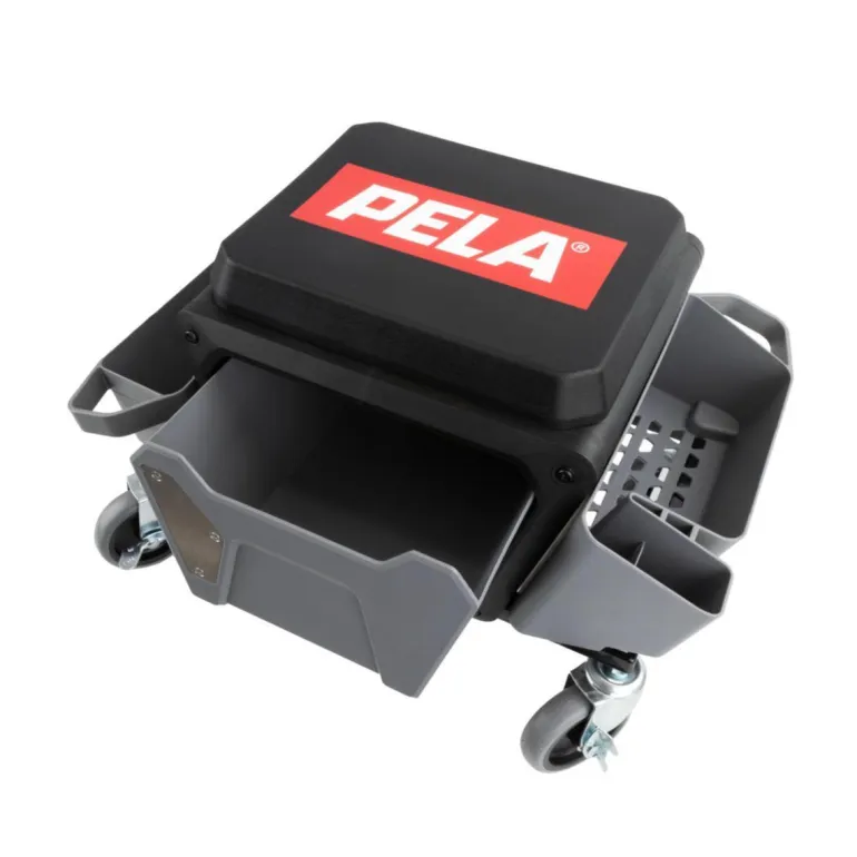 PELA 546242 on asentajanjakkara (työjakkara) pyörillä, jossa pehmeä PU-vaahtomuovipehmustettu istuin, ulosvedettävä säilytyslaatikko ja sivuilla lokerot esim. työkaluille, suihkepulloille, kiillotusaineille, mikrokuitupyyhkeille, sienille, harjoille jne.