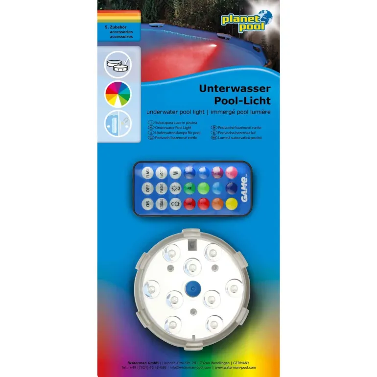 Planet Pool Flowclear on vedenpitävä aurinkokennolamppu, jossa on kehittynyt LED-tekniikka ja valo, joka vaihtaa useita värejä. Valo syttyy automaattisesti yöllä ja sopii erinomaisesti nurmikoiden tai terassien koristeluun.