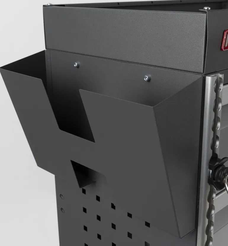 PELA 538174-autohyllystössä on 3 kuulalaakeroitua ulosvedettävää laatikkoa, 12 säilytyslaatikkoa 3 eri koossa sekä alhaalla puoliavoin säilytystila, jossa on avattava reuna. Yläosa toimii hyllytasona, jossa on jakaja keskellä ja reunat. Päädyn kahta asiakirjalokeroa voidaan käyttää säilytystilana esim. käynnistys- ja hitsauskaapeleille. Hyllyssä on myös kiskot kiinnitysrenkailla erilaisten esineiden tai tarvikkeiden kiinnittämiseen eri tasoissa. Perforoidut päädyt ripustuskoukkuja varten jne.