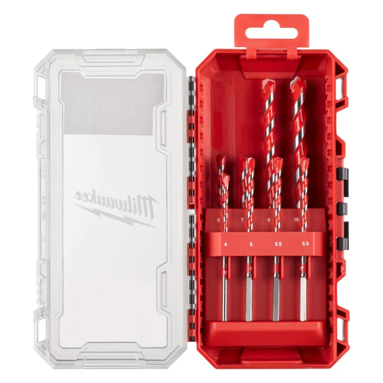 Milwaukee 4932493882 on volframikarbidikärjillä (TCT) varustettu betoniporanteräsarja, joka mahdollistaa poraamisen betoniin, harkkoihin, muuraukseen, liuskekiveen ja graniittiin. Alkaen koosta Ø 5 mm poranterissä on kolmiovarsi, joka estää sitä liukumasta istukassa (Ø 3 ja 4 mm poranterissä on pyöreä varsi).