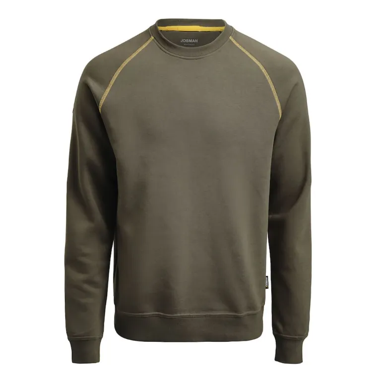 Jobman 5140 collegepaita raglanhihoilla. Harjattu sisäpuoli lisää käyttömukavuutta. Keltainen reunus kaula-aukon sisäpuolella.