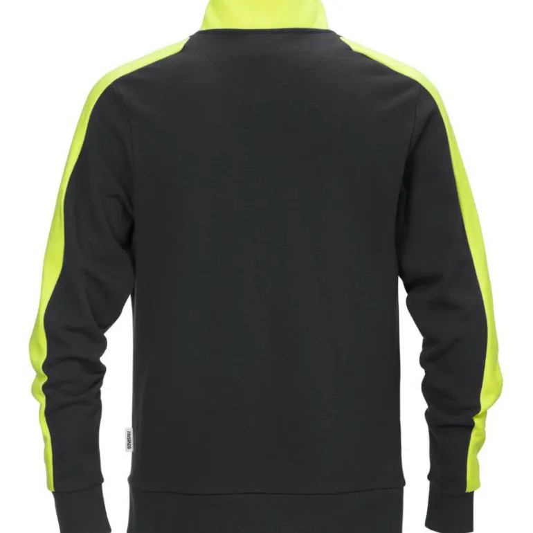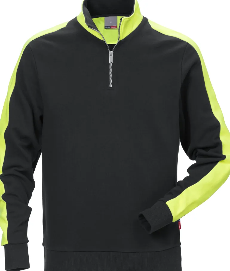 Collegepaita lyhyellä vetoketjulla, kontrastiväriset saumat ja resorit hihansuissa sekä helmassa. Paita on Öko-Tex-sertifioitu, ja sen olkapäiden ja käsivarsien keltaiset osat parantavat näkyvyyttä.