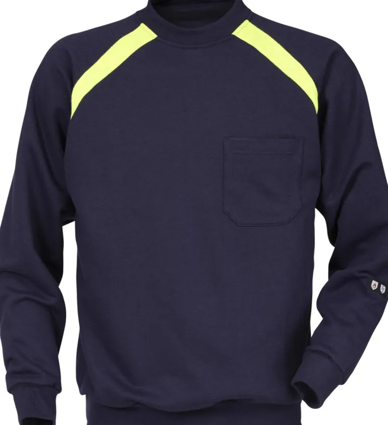 Mukava collegepusero neulotusta palosuojatusta materiaalista. Joustinneulos pääntiellä, hihansuissa ja helmassa mukavuutta ja lämmöneristystä varten. Näkyvyyttä parantavat kirkkaan keltaiset osat hartioilla. Rinnassa läpällinen rintatasku.