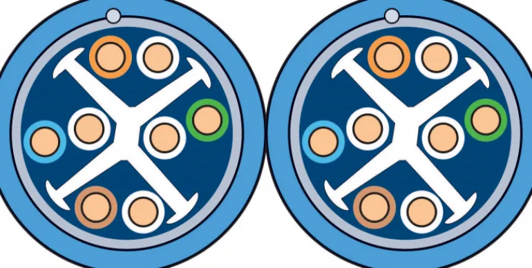 Suojattu Kat6A F-UTP -datakaapeli 4xAWG23 (550 MHz) sisäkäyttöön jakeluverkoissa. Kaapelissa on sininen halogeeniton ulkovaippa Dca s2d1a1 ja kaapeliin on painettu metriasteikko.
