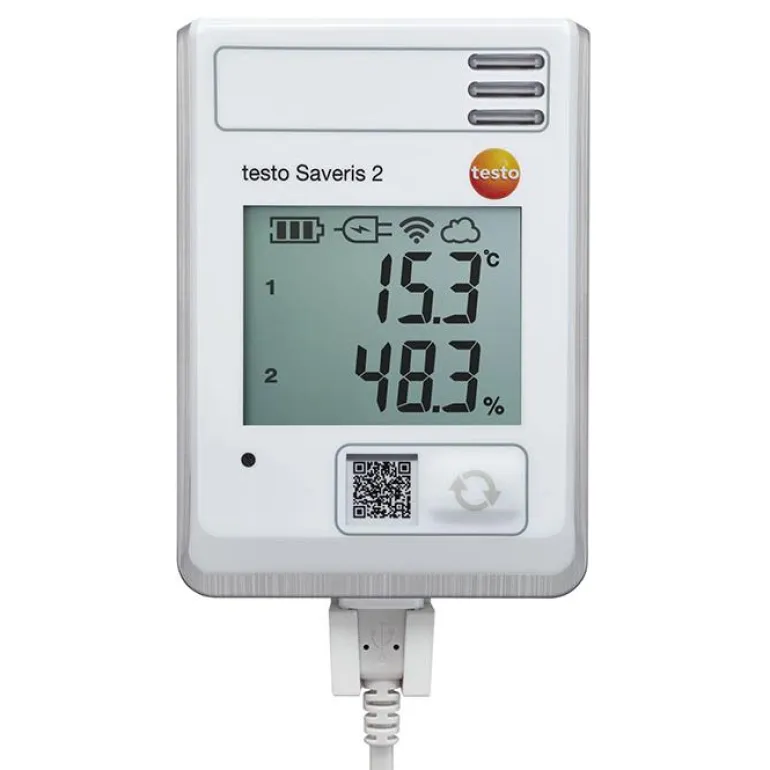 Todelliset mittausarvot, raja-arvojen rikkomukset ja jäljellä oleva akun aika näkyvät dataloggerin näytössä. Vakioparistojen (AA) käyttöikä on 12 kuukautta ja käyttäjät voivat itse vaihtaa ne milloin tahansa. WiFi-tiedonkeruulaitteen sisäinen tietomuisti on 2 x 10 000 lukemaa ja kuoressa on IP65-suojaus. Testo Saveris 2-H1 on TÜV Südin testaama standardin EN 12830 mukaisesti.