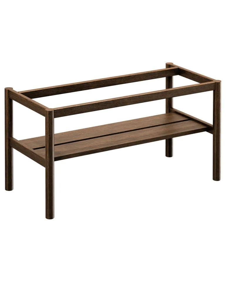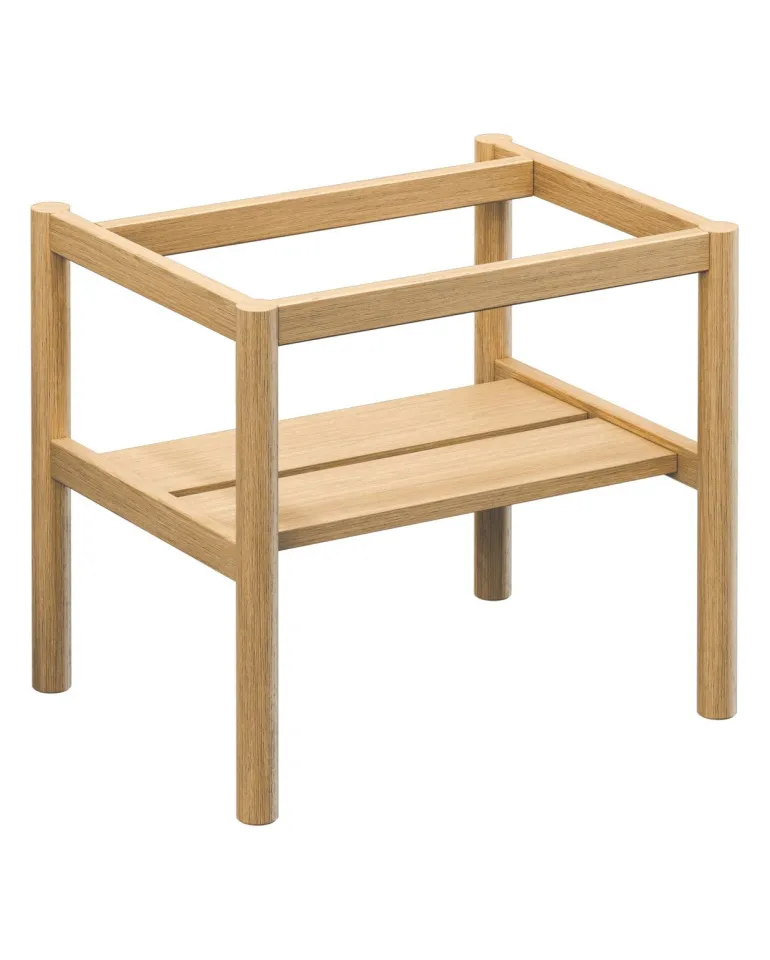 Ruskeasta massiivitammesta valmistettu tukikehys säilytystasolla Gustavsberg Ducentic-allaskaapille. Leveys 100 cm. Luotu Gustavsbergin 200-vuotisjuhlavuotta varten, käsityötaidon ja muotoilun perinteen juhlistamiseksi. Saatavana eri väreissä.