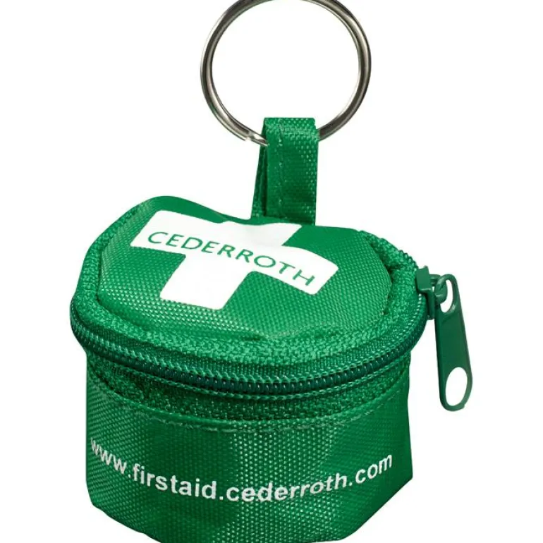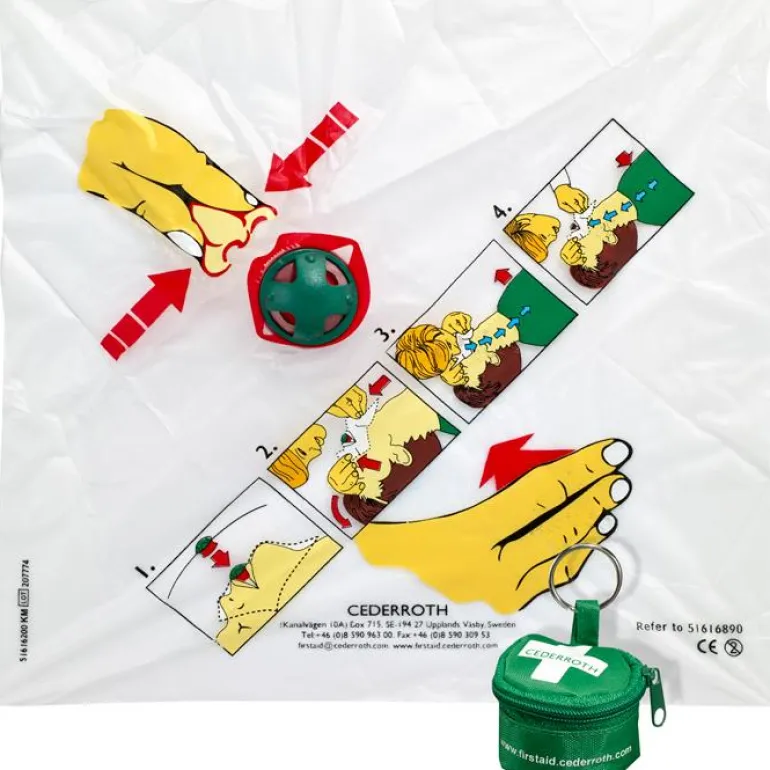Elvytyssuoja-avaimenperä käytännöllisessä kotelossa. Apuväline auttaa antamaan suusta suuhun -hengitystä oikealla tavalla. Lisäksi se pienentää tartuntariskiä auttajan ja autettavan välillä. Hengitysnaamari on varustettu venttiilillä. Suojaliinan reilu koko estää auttajaa joutumasta kontaktiin elvytettävän veren tai oksennuksen kanssa.