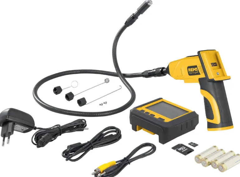 REMS CamScope S Set, mukana kamerakaapelisarja Color 16-1. REMS CamScope S Set on kannettava kätevä radiotekniikalla toteutettu tarkastuskamera, joka helpottaa vaikeasti tavoitettavien paikkojen, kuten onteloiden, kuilujen, putkien jne. tarkastusta ja vaurioiden analysointia. Kuvien ja videoiden ja äänitallenteiden dokumentointi MicroSD-kortille. Käsiyksikkö, jossa 4 paristoa 1,5 V, AA, LR6. Irrotettava ohjainyksikkö, radiotekniikka, 3,5″:n TFT-LCD-värinäyttö, 3-kertainen digitaalinen zoom, MicroSD-korttipaikka, USB-liitäntä, videolähtö, PAL/NTSC, integroitu.