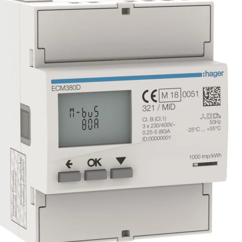 Energiamittari 3-vaiheiseen suoramittaukseen MBUS-yhteydellä. Nelimoduulinen MBUS-mittari mittaa sähköasennuksessa käytettävää aktiivista ja reaktiivista energiaa. Laitteessa on taustavalaistu LCD-näyttö ja kolme painiketta, joilla näytetään tehosteet, V, I, PF, F, P, Q, ja määritetään tietyt parametrit. Tämän mittarin suunnittelu ja valmistus täyttää standardin EN 50470-3 vaatimukset. MID-hyväksytty.