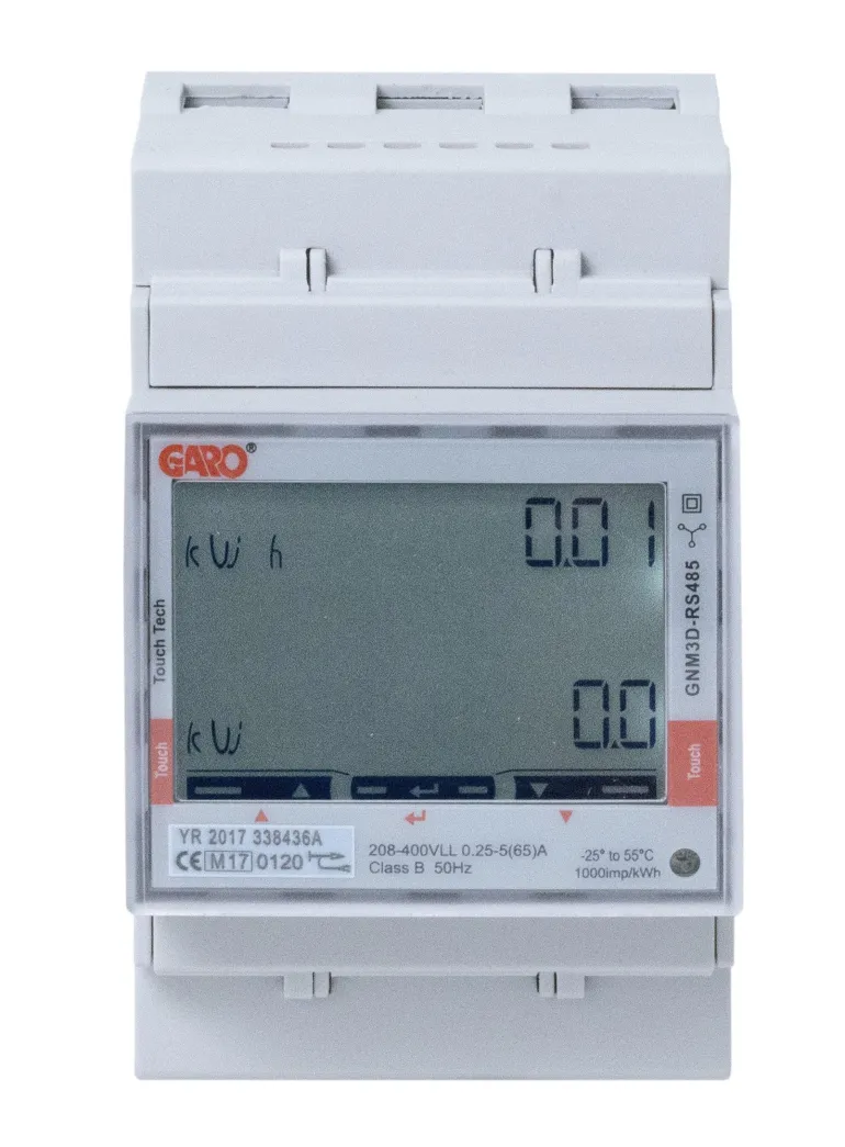 Garo 108047 on digitaalinen energiamittari kolmivaihejärjestelmään. Vain kolmen moduulin levyinen, ja siksi erittäin helppo asentaa kaikentyyppisiin DIN-asennettaviin jakokeskuksiin. Näytössä näkyy kokonaiskulutus kilowattitunteina ja hetkellinen kulutus kilowatteina. Näyttöpainikkeiden avulla näytetään myös tietoja virrasta ja jännitteestä vaihetta kohden. Lisäksi käytössä on visuaalinen hälytystoiminto, joka ilmaisee, jos vaihejärjestys on virheellinen.