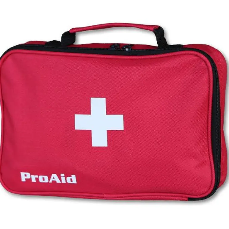 Nyloninen ensiapulaukku, kahva yläpuolella. Sopii työpaikoille, joilla työskentely voi olla vaarallista. Sisältää mm. hengityssuojaimen, palovammasuihkeen, silmähuuhteen, kangassakset, haavateippiä, leikattavaa laastaria jne.