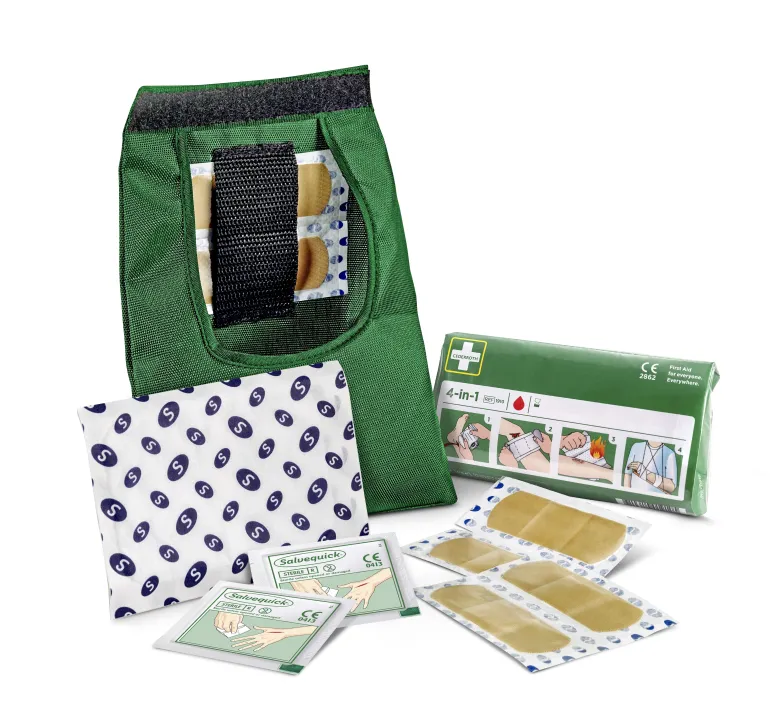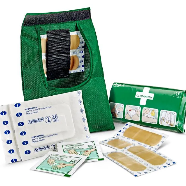 First Aid Kit Small -laukun kuorimateriaali on kestävää nailonkangasta, joka suojaa tuotteet lialta ja pölyltä. Käytännöllisen tarrakiinnityksen ansiosta laukku on nopeasti ja helposti avattava. Pieni, joustava laukku kulkee mukana taskussa tai lenkeillä vyöhön kiinnitettynä. Kaikkien tuotteiden mukana on selkeät käyttöohjeet. Laukun vihreä ja keltainen signaaliväri näkyvät kaukaa.