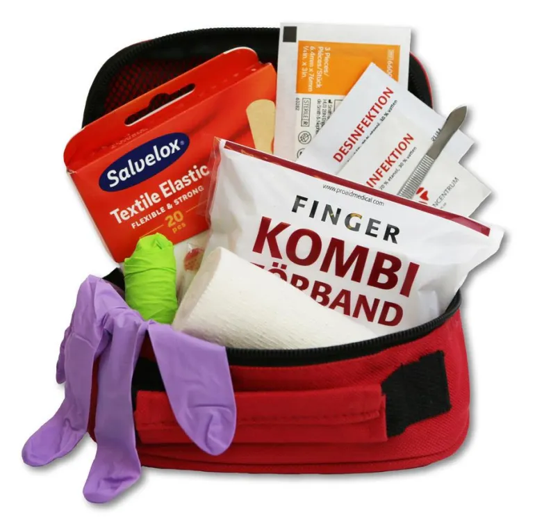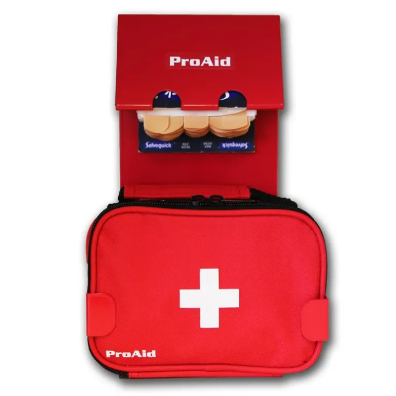 Ensiapupakkaus ja ensiaputaulu. Taulu on pieni, joten ensiapuvälineet mahtuvat pienemmillekin pinnoille. Taulu sopii siksi hyvin loma-asuntoon, veneeseen, asuntovaunuun ja matkailuautoon, jossa on rajoitettuun tilaan on mahduttava paljon. Pakkaus sopii myös pieniin kotitalouksiin tai kenties asuntolahuoneisiin.