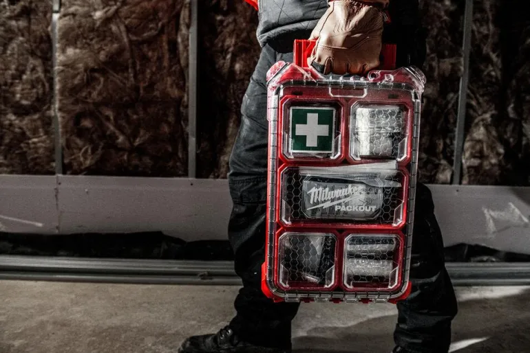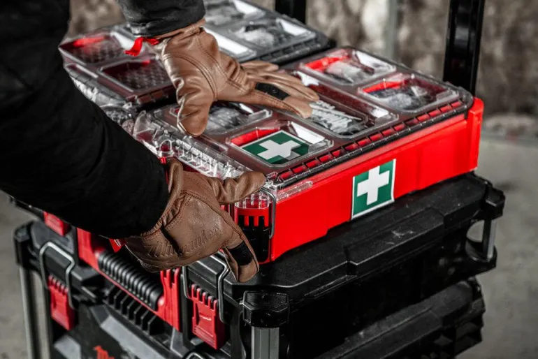 Milwaukee Packout -ensiapupakkaus. Packout-laatikko on punainen, jotta löytyy nopeasti hätätilanteessa. Osa Packout–säilytysjärjestelmää. Laatikko on valmistettu iskunkestävästä polymeeristä, joka kestää hyvin työpaikalla ja se on IP65-luokiteltu suojaamaan kosteudelta ja pölyltä. Sisätiloissa on 5 irrotettavaa ja asennettavaa lokeroa sekä älykkäät muovilokerot, jotka pitävät tuotteet paikallaan kuljetuksen aikana. DIN 13157-yhteensopiva ensiapupakkaus.