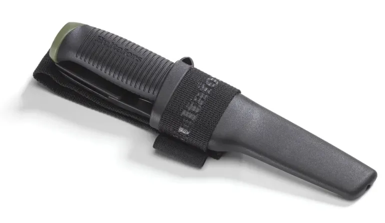 Monipuolinen ja kestävä eräpuukko pitävällä kahvalla sopii rankkoihin ulkotöihin. Kankainen vyölenkki sopii 80 mm leveisiin ja siinä on tasku tuluksille