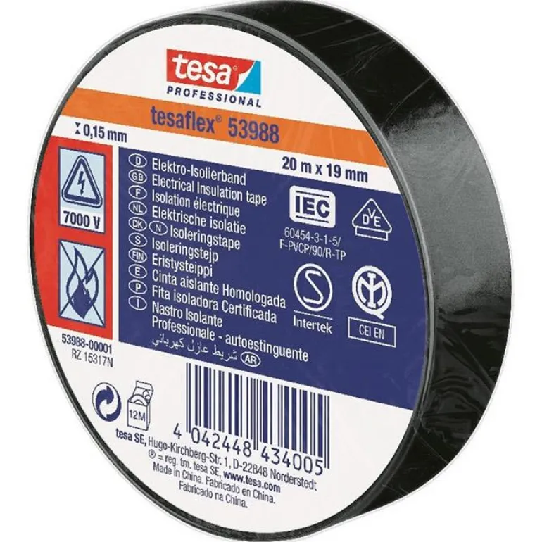 Tesa 53988 on pehmeä PVC-eristysteippi, joka on luotettava apuväline sähköasentajille, mekaanikoille ja muille ammattilaisille. Sille on ominaista suhteellisen paksu kantavuus, suuri joustavuus ja erittäin hyvä pitokyky (myös teräksessä ja alhaisissa lämpötiloissa). PVC-eristysteippi soveltuu kaapeleiden eristämisen ja merkitsemisen lisäksi myös korjauksiin ja niputukseen.