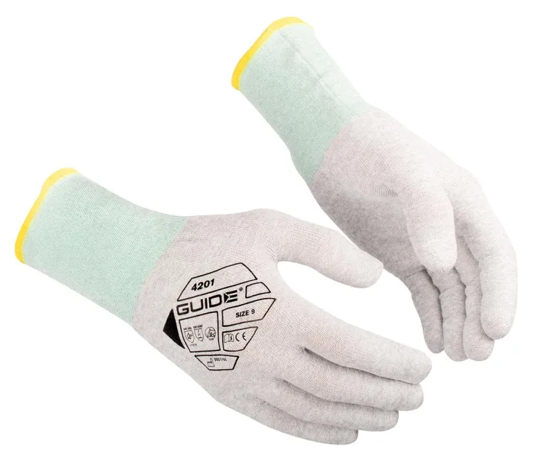 Guide Gloves 4201 on ohut, ilmava ESD-käsine nailonia ja hiilikuitua. Suunniteltu poistamaan modernia teknologiaa mahdollisesti vahingoittavan staattisen sähkön riskin. Soveltuu kosketusnäyttöjen käyttämiseen.