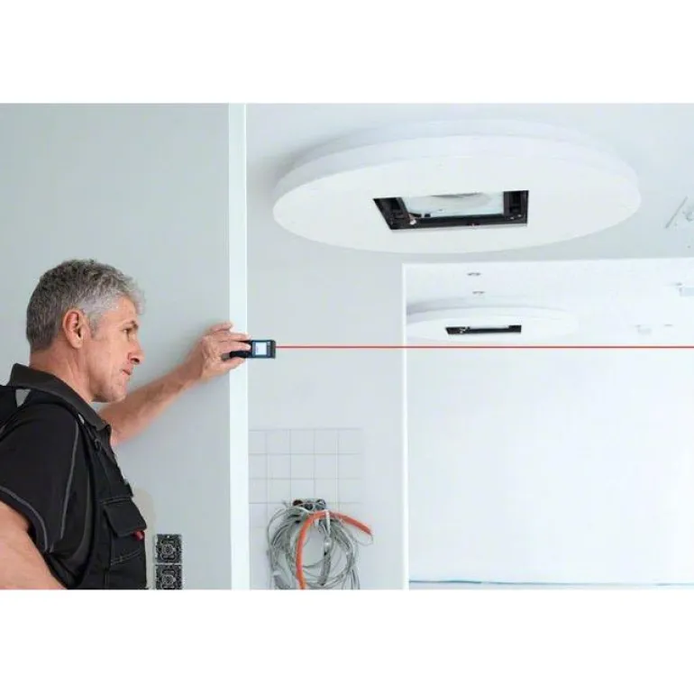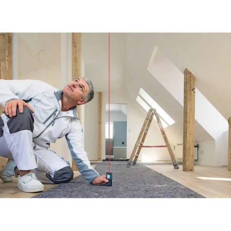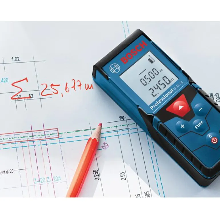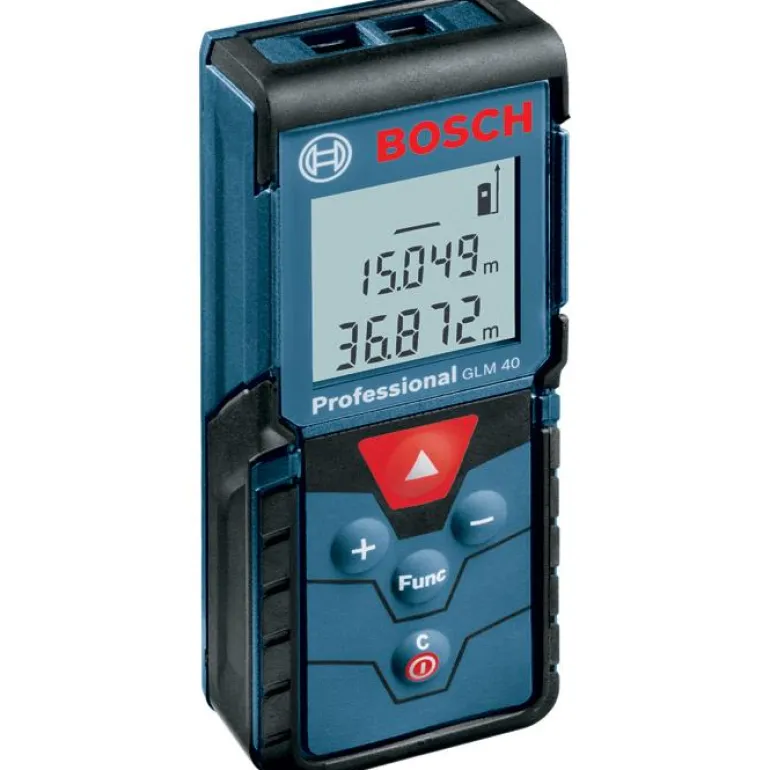 Bosch GLM 40 Professional on rakentajien suosima vankka etäisyysmittari. Helppokäyttöisessä etäisyysmittarissa on Softgrip-kädensija. Selkeät painikkeet ja helppolukuinen näyttö. Raskaaseen käyttöön, IP54: suojattu kestämään rakennustyömaan pölyä, roiskevettä ja iskuja. Lasermittarin muistiin voi tallentaa 10 mittausta, mittari laskee pinta-alat ja tilavuudet sekä Pythagoraan lauseen.