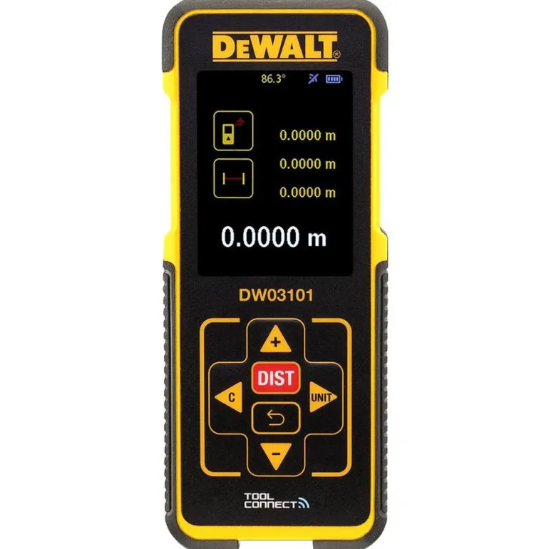 Dewalt DW03101-XJ -laseretäisyysmittalaite on valmistettu kestämään tahattomia pudotuksia työmaalla. Mittarin toimintasäde on jopa 100 metriä ja tarkkuusvaihtelu +/- 1 mm. Monipuolisiin toimintoihin lukeutuvat muun muassa suorat mittaukset sekä pinta- ja tilavuuslaskelmat. Dewalt DW03101 -etäisyysmittarin käyttäjä voi valita jatkuvan mittauksen, mikä mahdollistaa layout-sovellukset. Lisäksi käytettävissä ovat lukemien lisäys- ja vähennystoiminto ja etäisyyden mittaus. Pythagoraan epäsuora korkeustoiminto mahdollistaa etäisyyden mittaamisen myös, vaikka pistettä A ja/tai B ei pysty mittamaan suoraan. Mittarissa on myös integroitu kallistusmittari, jota voidaan käyttää digitaalisena vesivaakana sekä epäsuorien korkeusarvojen tai epäsuorien vaakasuuntaisten etäisyyksien laskemiseen. Monitoiminen pääkappale takaa monikäyttöisyyden ja mittaustarkkuuden kulmissa ja pystypinnoilla.