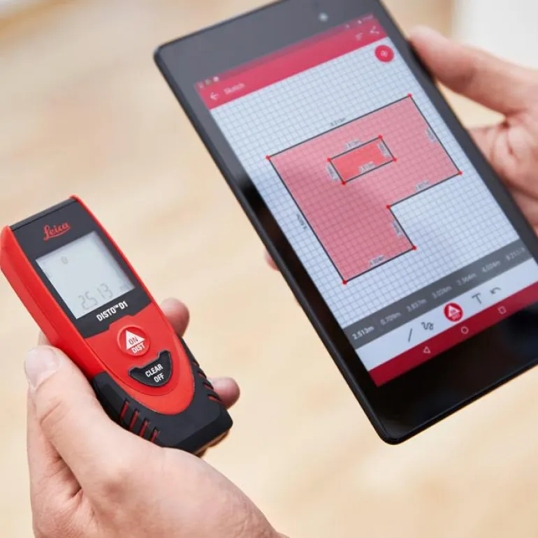 Leica Disto D1 sopii erinomaisesti etäisyyden nopeaan mittaamiseen. Sinun on ehkä laskettava materiaalintarve nopeasti tai suunnittelet remontointia kotonasi. Leica Disto D1 -mittarissa on sisäänrakennettu bluetooth ja Leican ilmainen sketch-sovellus, jonka avulla sinulla on rajattomat mahdollisuudet tehdä piirroksia ja pohjapiirroksia sekä dokumentoida mittaustulokset kuviin tabletilla tai älypuhelimella.
