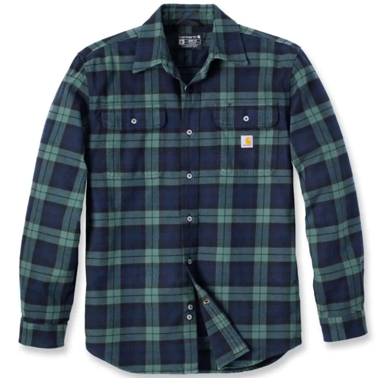 Carharttin ruudullinen flanellipaita (sininen) Loose Fit -istuvuudella. 100% puuvillaa (Heavyweight Flannel, 8 oz/yd² – 271 gsm). Kestävä ja mukava flanellipaita. Pitkät hihat (Long Sleeve), nappilista edessä sekä kaksi läpällistä napilla suljettavaa rintataskua, joista oikeassa on lisäksi kynäaukko. Kaksinappiset hihansuut pidennetyillä halkioilla. Paita on vahvistettu kolminkertaisilla pääsaumoilla, mikä lisää kestävyyttä. Kaareva helma takana. Konepesu 40°C.