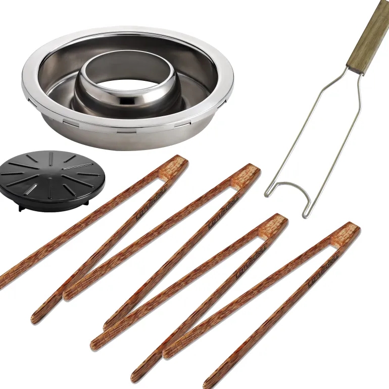Fonduesetti, joka sopii 34 cm:n kokoiseen LotusGrill-grilliin. Sopii kaikenlaisille fondueille, kuten juustolle, suklaalle ja lihalle. Voit samanaikaisesti grillata lihaa tai vihanneksia grillilevyllä.
