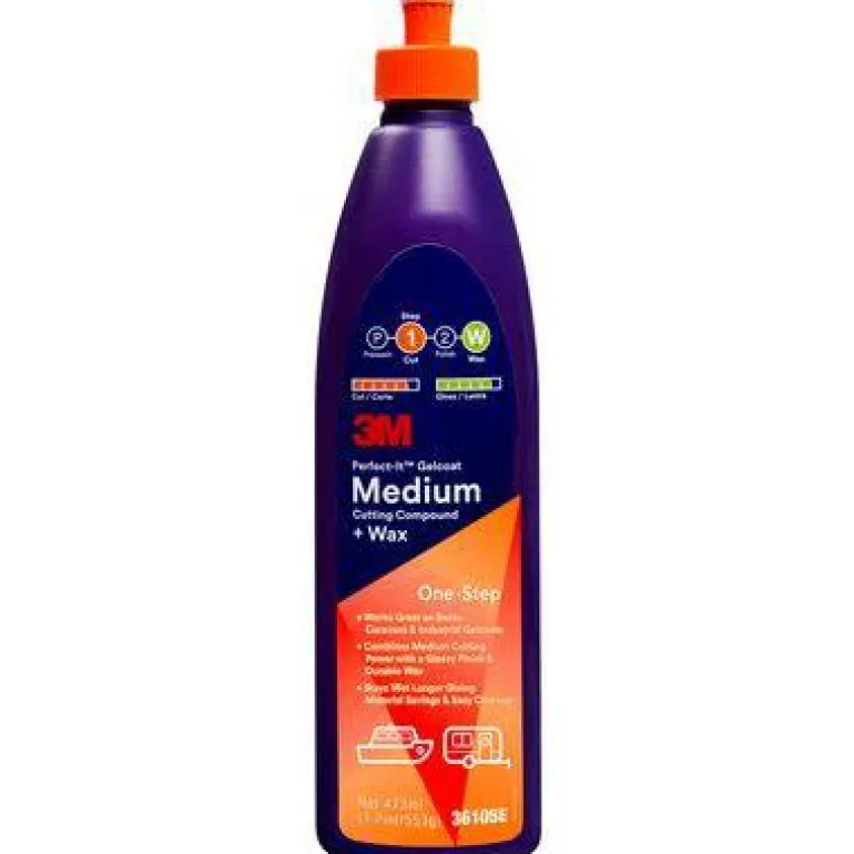 3M Perfect-It Gelcoat Medium on geelipinnoitteen keskitasoinen leikkausyhdiste ja -vaha, joka yhdistää keskitasoisen leikkaustehon kestävään vahaan, jolla saa ammattilaistasoisen yhdenvaiheen geelipinnoiteyhdistelmän. Yhdiste sopii ympäristöihin, jotka eivät ole herkkiä silikonille. Voidaan käyttää leikkaamiseen, kiillottamiseen ja vahaukseen yhdellä kertaa, mikä säästää aikaa ja rahaa. 6 kpl.