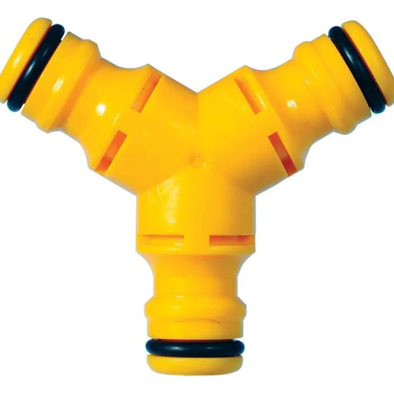 Haaroitusliitin, jonka avulla kolme letkua voidaan liittää yhteen letkujärjestelmän pidentämiseksi. Jakaa veden virtauksen kahteen eri suuntaan ja on siten ihanteellinen puutarhan eri alueiden samanaikaiseen kasteluun.
