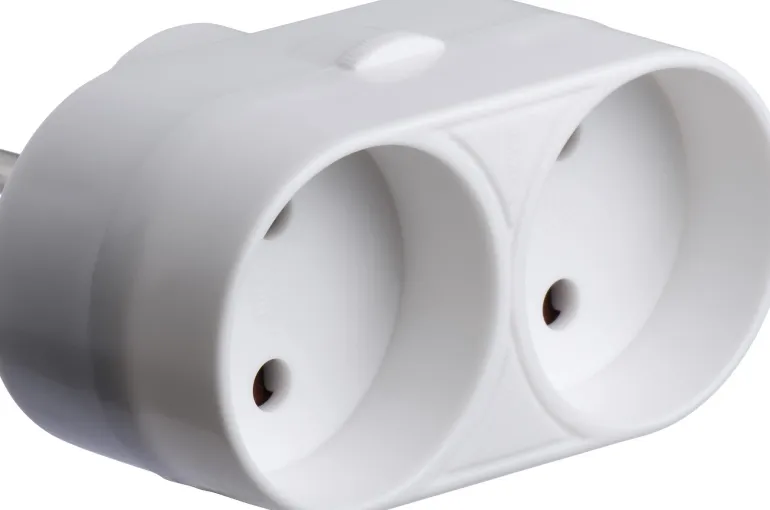 Valkoinen haaroitin, jossa 2 maadoittamatonta pistorasiaa. Valmistettu muovista.