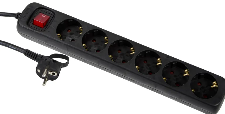 Haaroitusjatkojohto 2-napaisella katkaisimella ja 6 pistorasialla. Mallissa on 1,4 m pitkä virtajohto ja viistoon asetetut pistorasiat, jotka ovat 45° kulmassa.