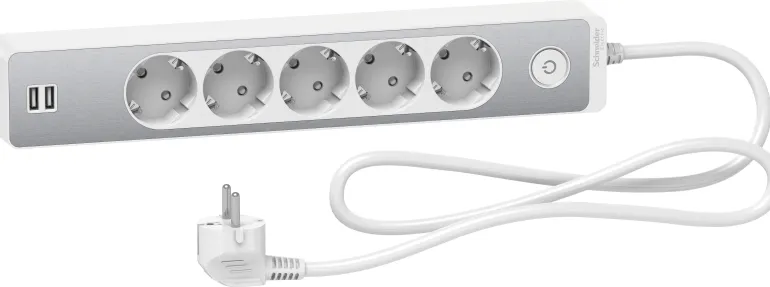 Vahva haaroitusjohto, jonka muotoilu on siisti ja saa mielellään olla näkösällä. Kaltevat pistorasiat. Haaraoitusjohdossa on kaksi USB A-liitäntää, jotka mahdollistavat puhelimien, tablettien ja muiden laitteiden nopean latauksen. USB-liitännät antavat yhteensä 2,4 A (maks. 2,4 A/portti).
