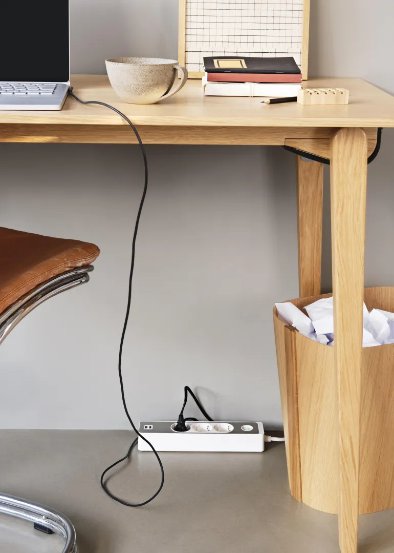 Vahva haaroitusjohto, jonka muotoilu on siisti ja saa mielellään olla näkösällä. Kaltevat pistorasiat.