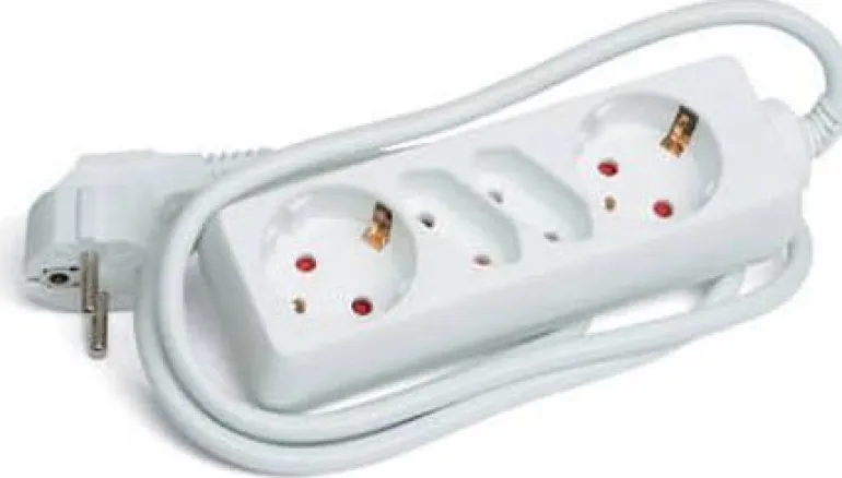 Maadoitettu 2+2-osainen valkoinen haaroitusjatkojohto. 2 Schuko 45 gr ja 2 Euro-pistorasiaa.