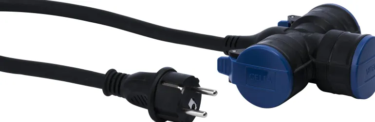 3-osainen haaroitusjatkojohto itsesulkeutuvalla kannella, joka kestää 3680 W. Muottivalettu – luja ja turvallinen. Kaapeli RDOE (H07RN-F). Hyväksytty ulkokäyttöön. IP44.
