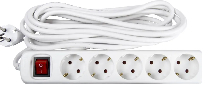 Haaroitusjatkojohto 2-napaisella katkaisimella ja 5 kpl. Schucko-pistokkeella. Mallissa on viistoon asetetut pistorasiat, mikä antaa tilaa muuntajille.