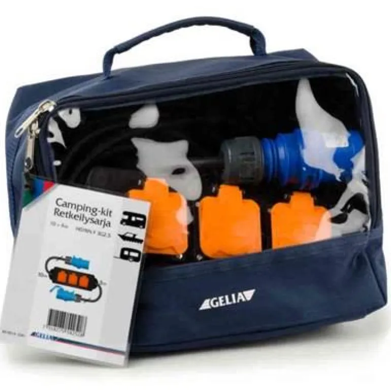 Gelia 4005151041 on 3-osainen maadoitettu haaroitusjatkojohto, jossa on itsesulkeutuva kansi, säilytyslaukussa. Kätevä sarja vapaa-ajan matkoille asuntovaunuun, matkailuautoon tai veneeseen, kun tarvitaan kaapelia ja kannellista haaroitusjatkojohtoa sähkötolpan ja vaunun/auton/veneen välille.