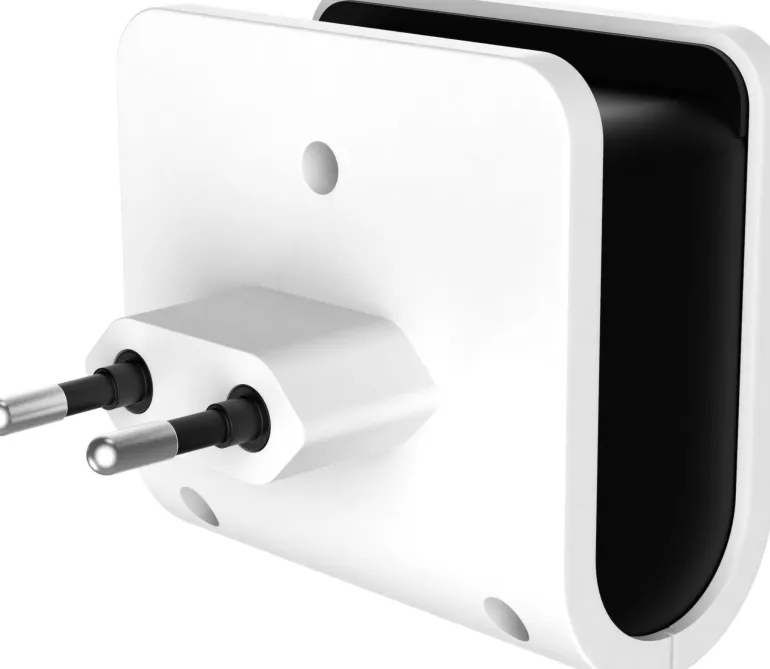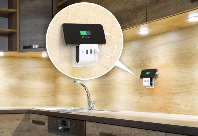 Valkoinen haaroituspistotulppa, jossa on 3 USB-A-pistorasiaa, 1 USB-C-pistorasia ja sisäänrakennettu taso puhelimelle latauksen aikana. USB-yhteensopivien laitteiden, kuten matkapuhelinten, tablettien, kameroiden, GPS-laitteiden jne. lataamiseen.
